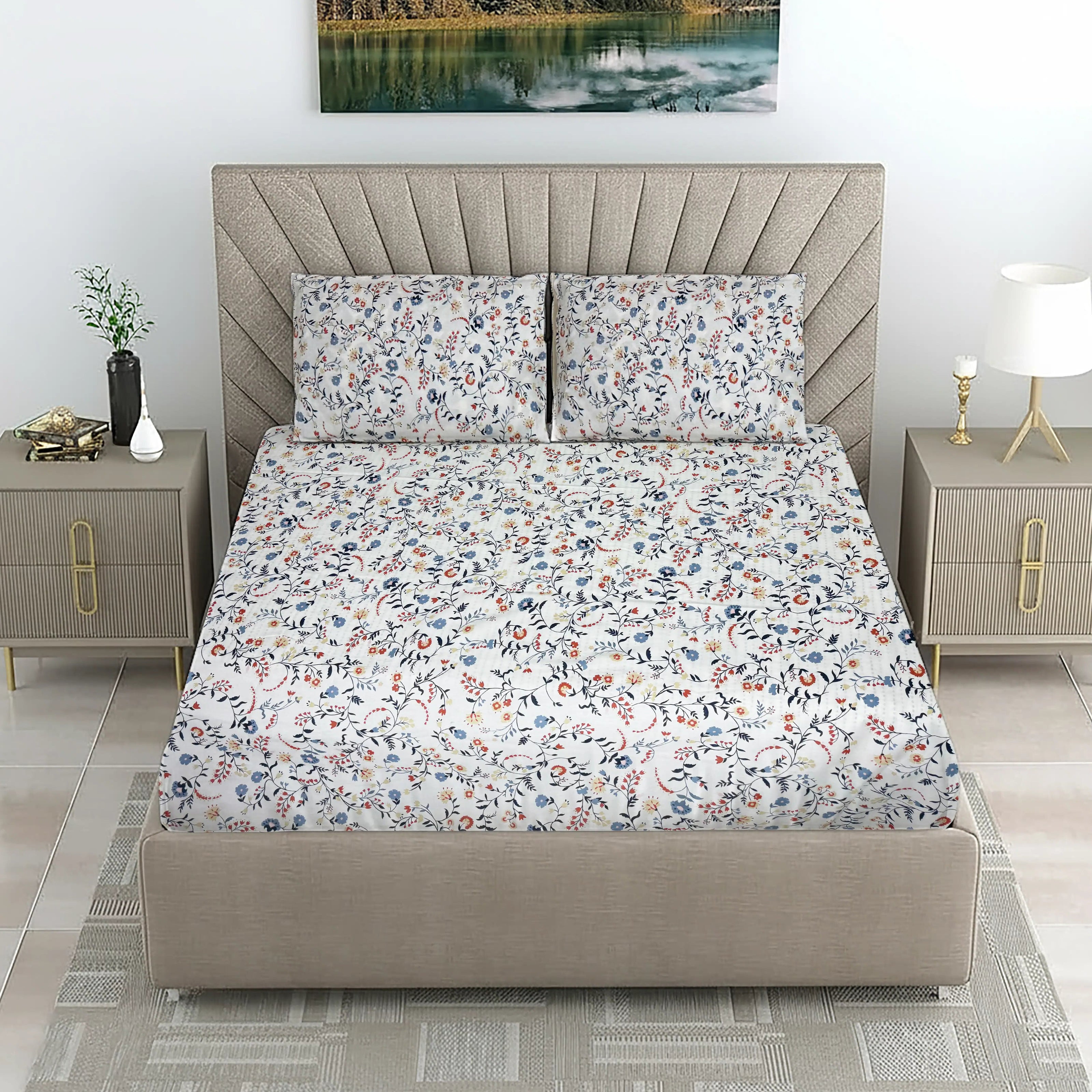 Elegant White Base Bed Sheet with Grey Leaf Design & Pillow Covers